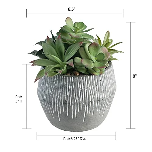 - [HIGH QUALITY PRODUCT]: The amazing detail adds dimension. The small artificial succulents, made from durable Polyurethane, are nestled in a gray, coconut-shaped cement pot, which is etched with white lines. Quality checks are done several times, including drop testing to make sure it arrives at your home in perfect condition. 8.5 x 8.5 x 8.75 inches