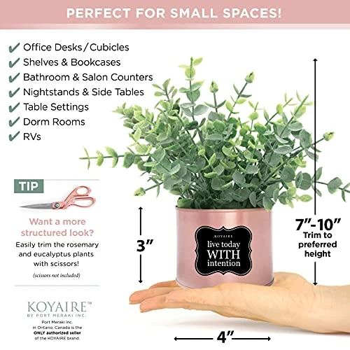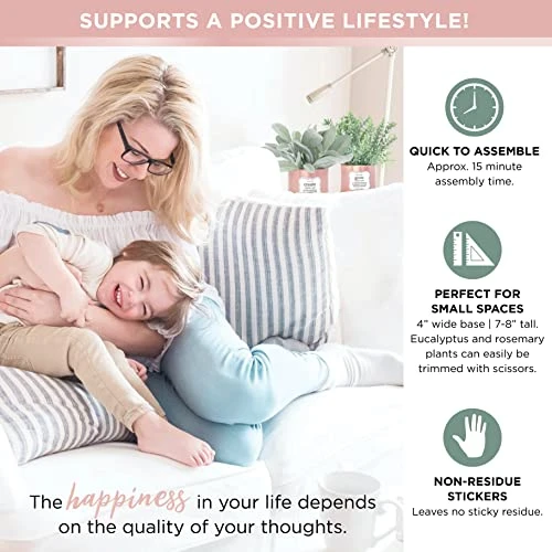 - ✅ FLOCKED LEAVES ! This set of home and office decor for women comes with 3 flocked, small fake plants: rosemary, eucalyptus and oh-so-velvety lamb’s ear. Simply place each faux desk plant into a tin and add the decorative white rocks to complete the 10 minute setup. And presto: motivating home office decor just like that! The eucalyptus and rosemary can easily be trimmed with scissors for a more sculpted look if preferred and, best of all, these plants do not require watering!