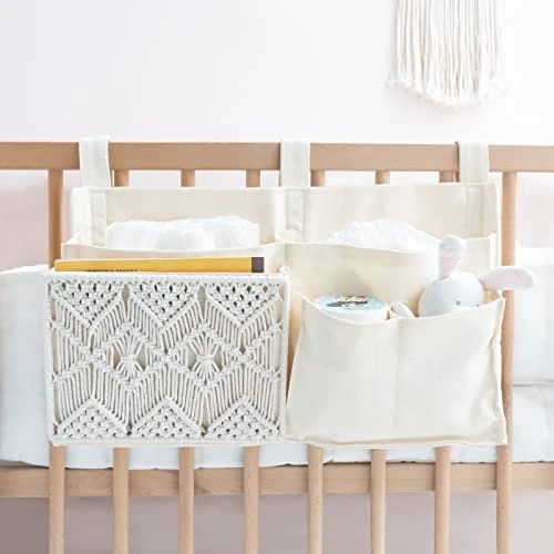 - High Quality: Made of strong cotton canvas, the bedside organizer is durable for use. With 7 pockets so that you can organize things separated and easily take them out. The outer pocket with a macrame woven pattern to make the bed hanger look more chic and attractive. –( It is protected by intellectual property right.)
