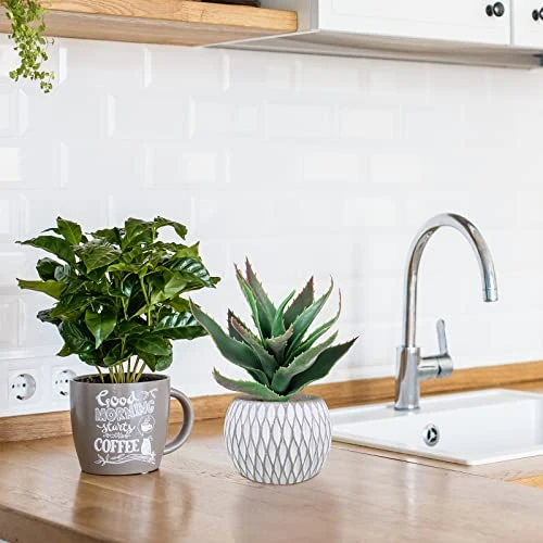 - Size: These small artificial potted succulent plants measure about 5.3″-5.9″ wide and 5.5″-10″ tall. Each cute concrete pot measures about 4.2″ wide and 3.2″ tall. These fake potted succulent plants can be displayed as a set or individually placed around your space. The compact size is great for limited-spaces such as tabletop, desks, coffee tables, shelf and windowsill.