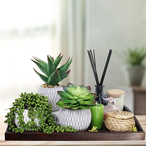 - Color: This set of potted succulent plants feature a variety of succulents in vibrant shades of green. They are lifelike and pre-potted in gray and white geometry pattern round pots with the pebbles. This hand-poured concrete pot is carved with a textured geometry design, emphasizing the graceful geometry. Simple yet unique, this array of faux potted succulents looks amazing on table, lend textural and geometric appeal to your modern home, and fresh charm to some neutral backdrops.